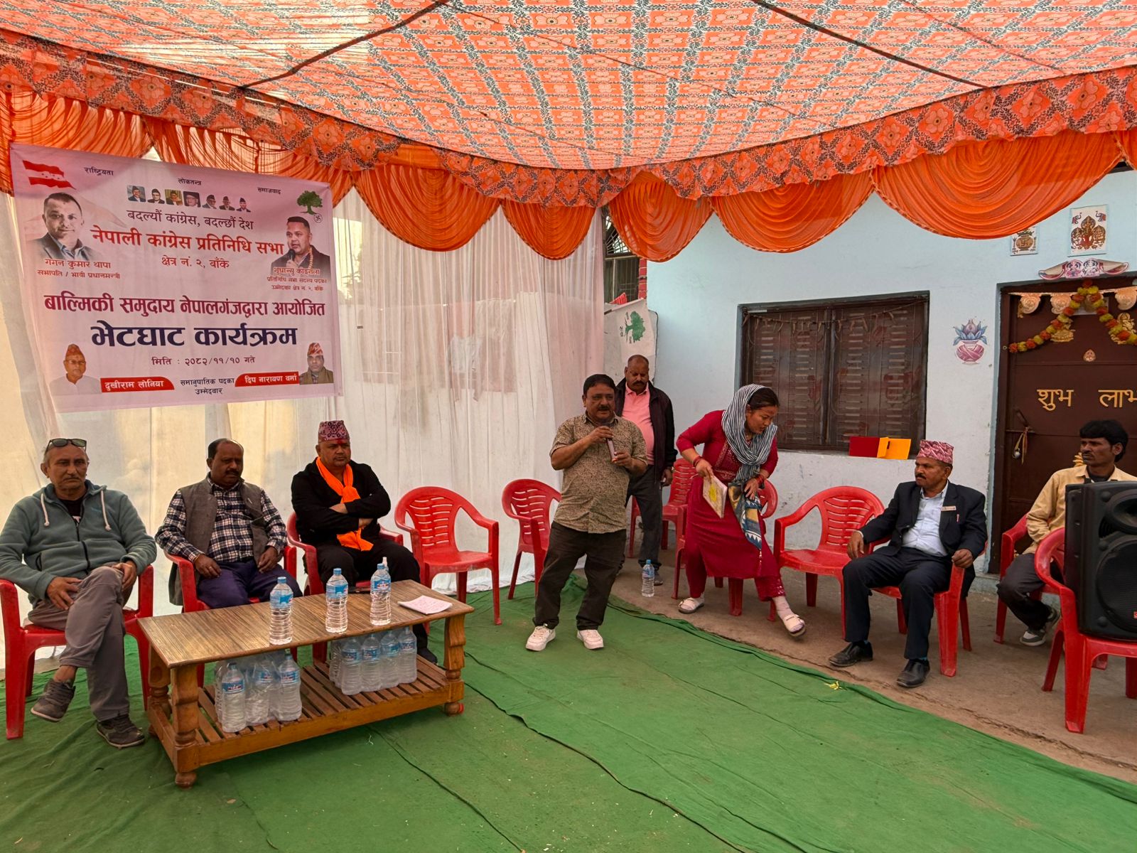 बाल्मिकी समुदाय नेपालगन्जको अगुवाईमा आइतबार(आज) भएको भेटघाटका क्रममा नेपाली कांग्रेसका उम्मेदवार शुधान्सु कोइरालासँग सहयोग गर्ने प्रतिवद्धता जनाएका हुन् ।
