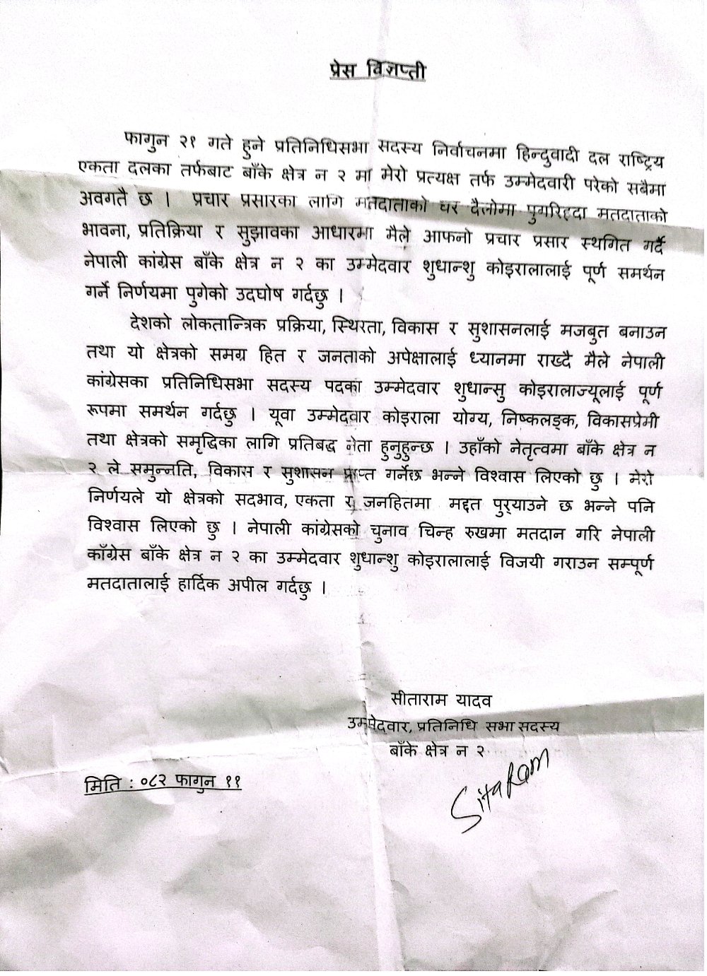 नेपाली कांग्रेसको तर्फबाट क्षेत्र नम्बर २ का उम्मेदवार शुधान्शु कोइरालालाई उनले समर्थन गरेका हुन् । आगामी फागुन २१ गते हुन लागेको प्रतिनिधिसभा सदस्य निर्वाचनमा राष्ट्रिय एकता दलको तर्फबाट उम्मेदवारी दिएका यादवलाई निर्वाचन आयोगले चुनाव चिन्ह ‘तुलसीको बोट’ प्रदान गरेको थियो ।